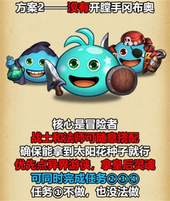 核心是冒险者,展示和法师可随意搭配,确保能拿到太阳花种子就行,优先点异界游侠,拿皇后灵魂,可同时完成任务2、3、4,任务1不做,也没法做。