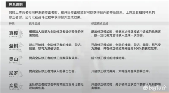 在深空之眼中,相同神系的角色一队时拥有不错的加成,可以看出游戏是鼓励同系队伍的,只是目前刚开服,一共只有21个角色,除了真樱系外,其他系角色参差不齐,所以纯系搭配不多,随着游戏的后续推进,队伍的搭配是要向同系队接近的。下图是目前游戏的神系加成,可以看出不同神系有着各自的队伍特色。
