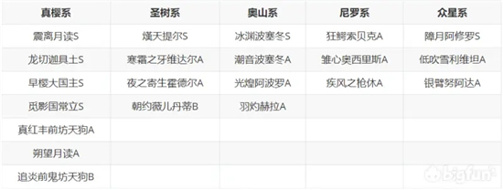 不知道为什么总觉得制作组偏心偏得厉害,真樱系一枝独秀,七个角色四个S,连国常立尊都翻出来了,而其余系才各一个S,尼罗系甚至一个没有……总之,开服队伍搭配推荐真樱系,角色多好搭配。