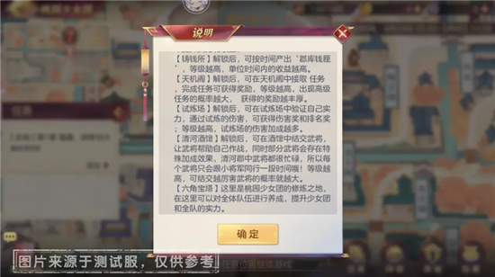 “试炼场”可通过不断挑战试炼BOSS,刷新记录以验证自己的实力。通过试炼的伤害,可获得“每日奖励”与“排行奖励”。建筑等级越高,对“桃园少女团”玩法内阵容的加成效果越多。