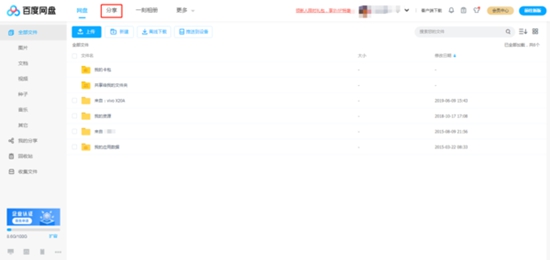 第二步,进入网盘页面后点击左上方【分享】;