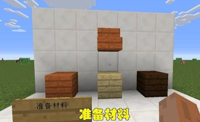 1.首先我们先准备好材料,合欢木板、白桦木板、深色橡木板以及合欢木楼梯,也可以用其他的材料,越坚固越好,如下图所示。