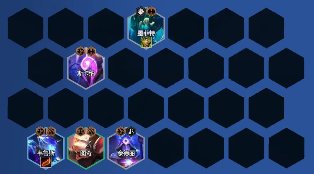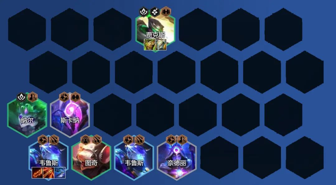 而杰斯、希瓦娜、纳尔这3枚棋子的技能都是范围一次性控制,可形成有效控制链,给我们后排输出棋子争取到非常优质的输出环境,让韦鲁斯可安稳叠加攻速。
