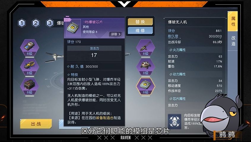 唯一不同的是【芯片】模组,包括爆破芯片、电磁芯片、治疗芯片,【芯片】模组的属性决定了成品无人机的功能。