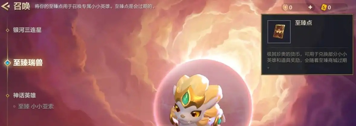 一、在金铲铲之战中,至臻点的作用是用来兑换至臻瑞兽的,200至臻点可以兑换一只至臻瑞兽。金铲铲之战至臻点主要是用来兑换至臻瑞兽这个小英雄的,目前的话至臻点只能换这个道具,但是至臻点是会过期的,所以玩家获取至臻点后要在本赛季中使用完,不然到了下一个赛季会自动结清。