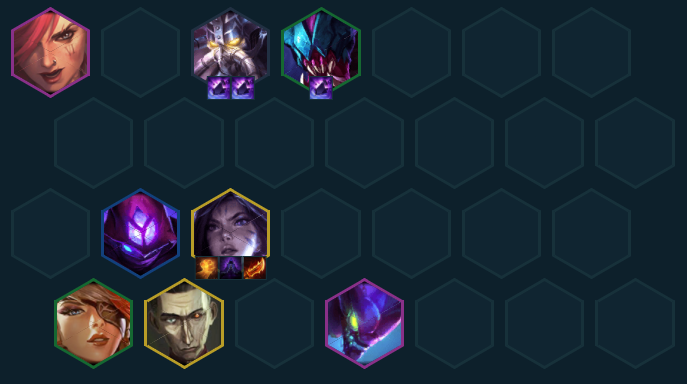 顺利的话拉八大搜找出至少一张卡莎,杰斯和希尔科谁来上谁都在后排加速卡莎和玛尔扎哈快速启动,都没有也可以先挂狐狸、维克托开2黑魔提升法强,搜出基础阵容加一星带装备卡莎就能锁血,后续先考虑在八级搜全员质量最好,如果觉得容错够也可以直接拉九找二星卡莎。站位上奎因站边角防卑鄙之钩机器人,假人和带虫子单位都放在前排快速献祭。