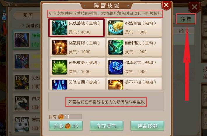 在技能栏里面选择阵营,就可以学习技能了。宠物阵营技能只能在阵营战中使用,阵营技能列表所有宠物通用,当宠物正式离开角色(及宠物主人发生变化时),自动失去宠物阵营技能。