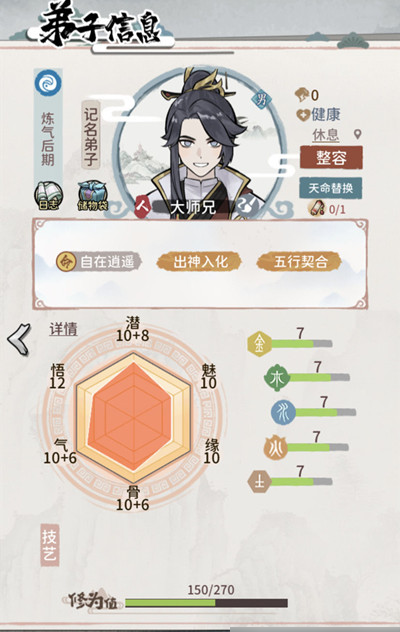 1、大师兄潜能很高,可以考虑当做打手,天赋就选武道和灵脉(第一个和第二个),工具人之后总还是能找到一些替代的,但是打手就没有那么容易有这么优秀的了。
