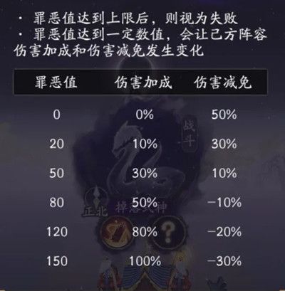3、罪恶值达到一定数值,会让己方阵容伤害加成和伤害减免发生变化。
