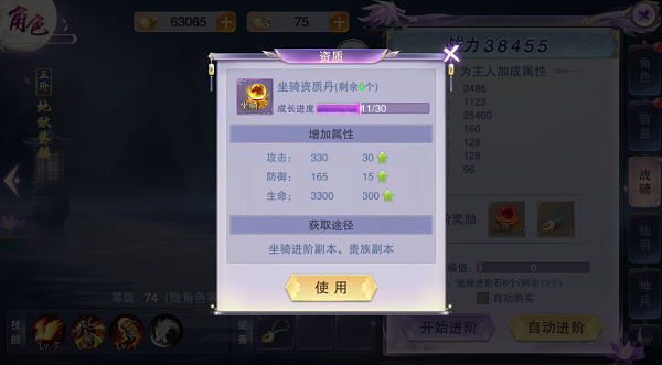 在形象进阶升级到指定阶数后,可以开启资质系统。阶数越高,资质等级上限越大。使用资质丹可以升级资质,资质升级后会增加固定属性,同时增加人物属性。