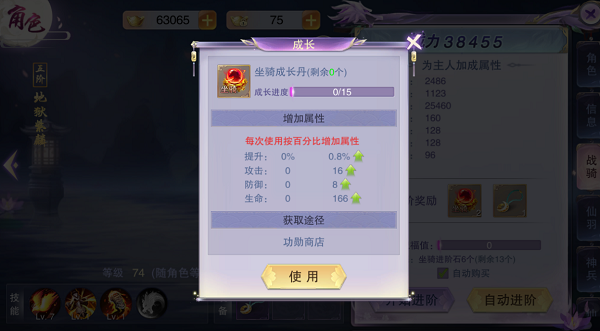 在形象进阶升级到指定阶数后,可以开启成长系统。阶数越高,成长等级上限越大。使用成长丹可以升级成长等级,成长等级升级后会增加百分比属性,同时增加人物属性。