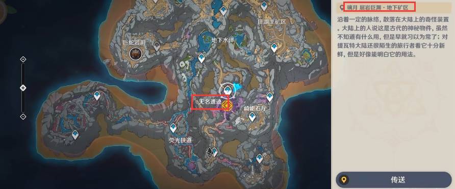 1、在无名遗迹可以上去,首先玩家需要从层岩巨渊地下矿区传送锚点传送过去。