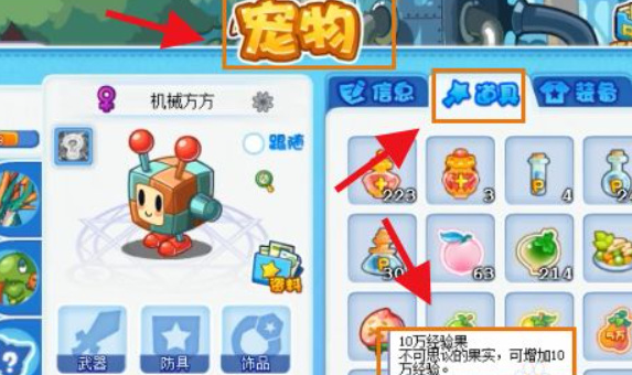 5、最后打开“宠物”,使用“经验果”道具,提升机器方方进化为“立方人”,就可以获取立方人。