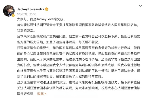 体育信息中心发布公告,英雄联盟项目运动员白家浩(369)和喻文波(Jackeylove),由于个人原因,提出退出杭州亚运会电子竞技项目国家集训队的申请。教练组及相关版权方按照择优顺序提出了更换建议,更换运动员:彭立勋(XUN)、赵嘉豪(Elk)。