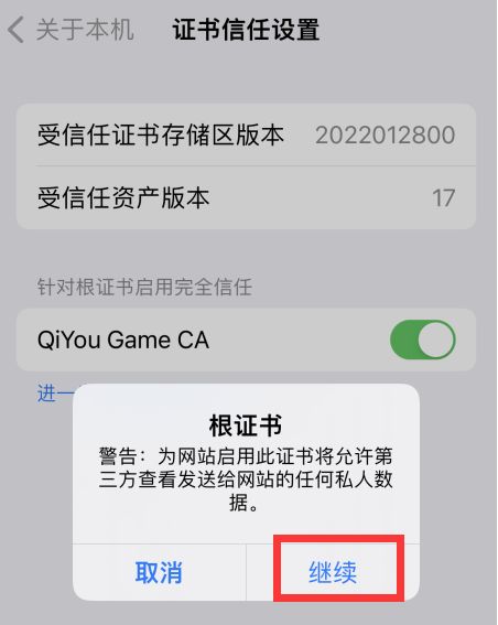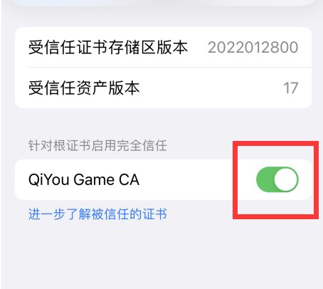 安装完后回到设置>通用>关于本机,滑动至底部,点击证书信任设置将刚添加的证书信任设置为打开。