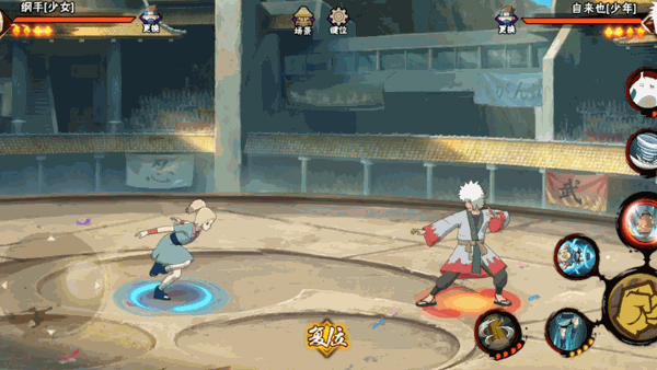 少女纲手进入二段跳,抓取地面或空中的忍者时,会有不同的攻击效果。