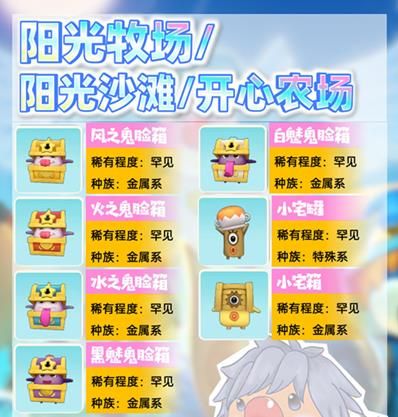 4、阳光牧场精灵:惊讶萝卜、地之鬼脸箱、火之鬼脸箱、风之鬼脸箱、水之鬼脸箱。