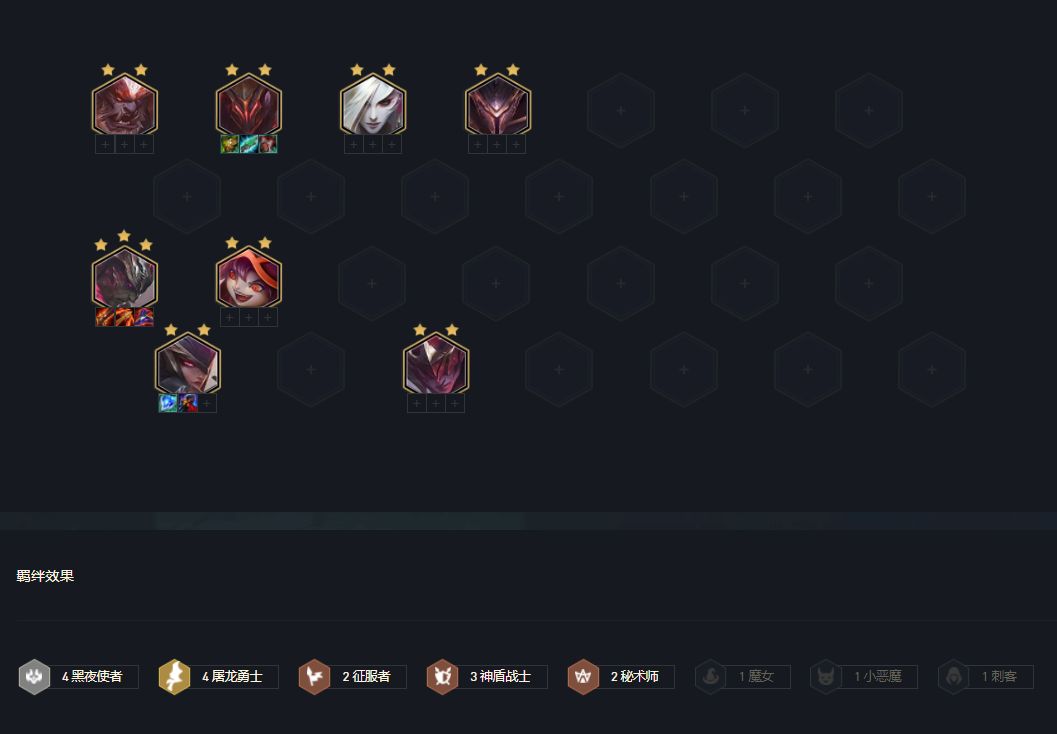 关键羁绊:4黑夜+4屠龙。阵容双C亚索、铁男,主坦潘森。