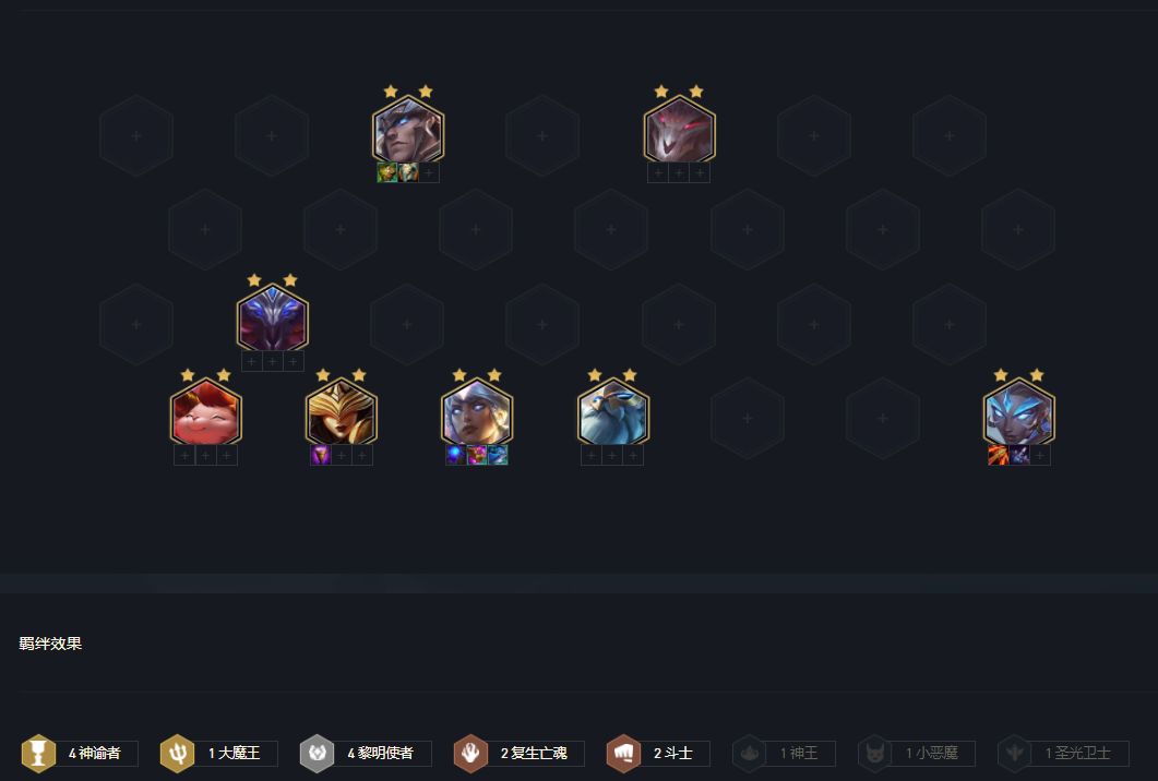 关键羁绊:4黎明+4神谕+2复生。阵容主C卡尔玛,副C豹女或提莫,主坦盖伦。