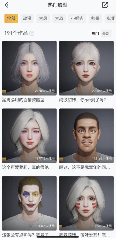 现阶段《和平营地》共计收纳了191个作品,以后还会逐步更新。热门脸型一共有9大类别,不同风格任由选择,一定有一款是你的菜。我们在《和平营地》不仅可以选择喜欢的脸型,如若你有更好作品,营地也支持你投稿,活动规则如下。