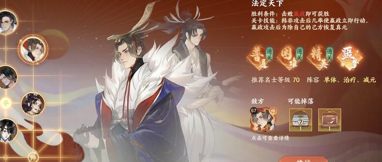 对面的角色等级全部为67级,其实就还好推荐等级为70级,首领为嬴政(将),韩非(士),嵇康(车),王昭君(马),卫青(马)。首先跟大家解释 一下为什么先讲法定天下,因为这是这三周以来,群里公认最恶心的联动轴承本,没有之一啊,因为韩非和嬴政的联动是AOE攻击。韩非作为士,有着当帅受到攻击时,士会反击技能释放单位(也就是100%反击)然后因为现在的队伍,都是单C队伍且大家主养的都是嬴政和李世民。我只能说高练度的嬴政和韩非,双C碾压一下都过去了,但是这个本,简直是单C噩梦。我全员60复活套四保一完全行不同,但凡我当初没洗我大秀宁,我怀疑我这周也单过了。四保一时真的难打这个本。后手有王昭君的减速和嵇康的睡眠关键位置,速度调不好就会导致乱速,或者李清照和袁天罡被控制,也就是根本啥都没干就连死两次。我对这个本的意见就是,有李世民的赌自己暴击加另外一个输出秒掉韩非,即可正常通关。