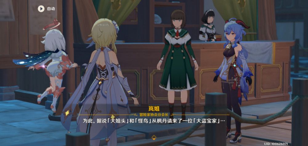 事件起始于璃月,甘雨和冒险家协会的岚姐发现附近的盗宝团越来越猖獗了,甚至已经开始不把深渊教团放在眼里了。这里,岚姐提到了盗宝团的南北两大巨头,即“南长姊”、“北怪鸟”。(这代号取得……北乔峰,南慕容?)