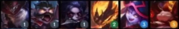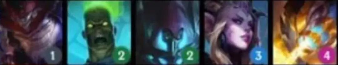 从左到右英雄分别为:薇恩(1)、沃里克(1)、赫卡里姆(2)、锤石(2)、维克多(2)、卡特琳娜(3)、德莱文(4)、瑞兹(4)、佛耶戈(5)。