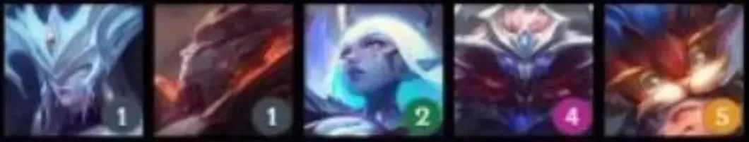 从左到右英雄:卡兹克(1)、乐芙兰(2)、卡特琳娜(3)、梦魇(3)、黛安娜(4)、佛耶戈(5)
