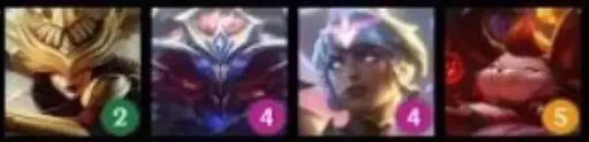 从左到右英雄:辛德拉(2)、艾翁(4)、卡尔玛(4)、提莫(5)