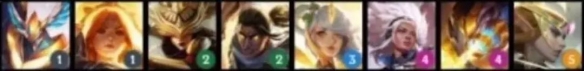 从左到右英雄分别为:弗拉基米尔(1),瑟庄妮(2),李青(3),莫甘娜(3),亚索(3),厄斐琉斯(4),黛安娜(4),德莱厄斯(5)