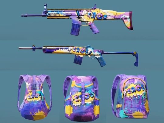 另外,在去年1周年的时候,光子还推出过一整套免费的“霓虹”系列皮肤。而这段时间的“四圣”活动中,就有“炫彩”系列的背包免费兑换,这个风格设计简直和“霓虹系列”太像了。
