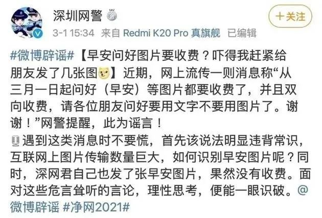 另外,3月1日,深圳网警发布《早安问好图片要收费?吓得我赶紧给朋友发了几张图》对该网传消息进行辟谣。