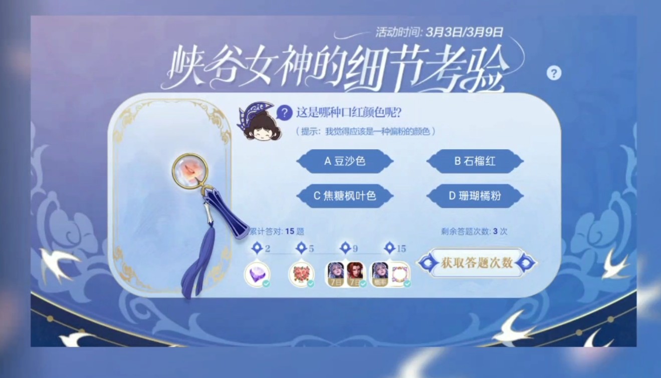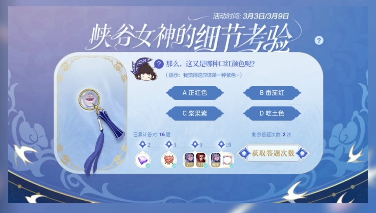 根据提示的“偏粉”,相信很多玩家都能反应过来选唯一一个有“粉”字的D选项,如果看提示还想不到的话……那就只好请你来看小编的攻略了~
