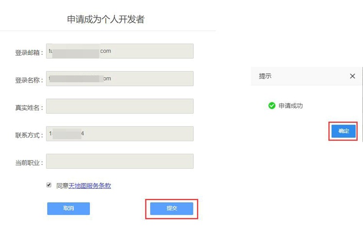 勾选【同意天地图服务条款】,点击【提交】,即可申请成功