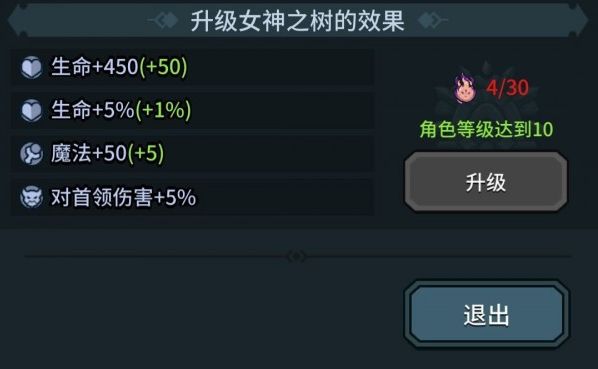 首先是一进去界面的女神之树,通过升级很直接的加成人物本身的属性和对领主伤害,而升级用的材料来自水柱洞窟的派遣,良心无消耗,挂机就完事儿了,升上去准没错!