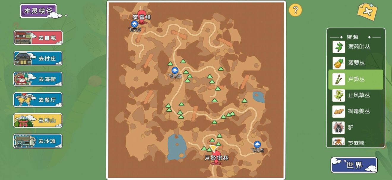 我们在这张地图上可以采集到:菠萝、芦笋、薄荷叶、止风草(果丛附近随机刷新)、御毒姜(果丛附近随机刷新);地图右边点开资源有分配。