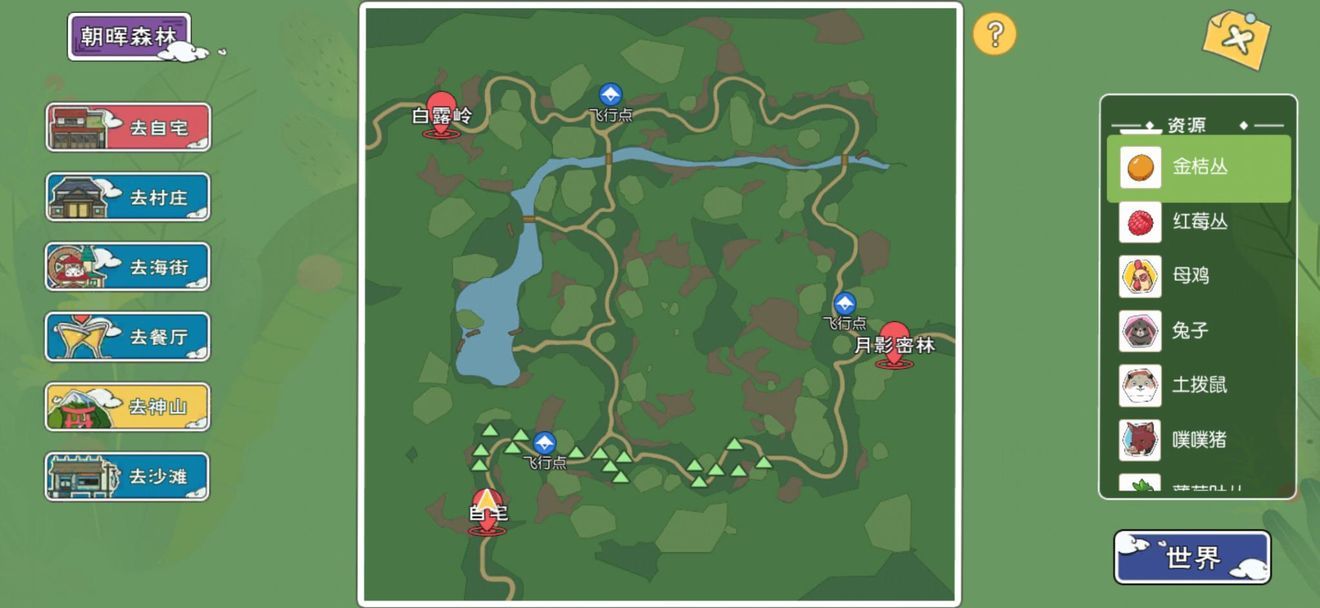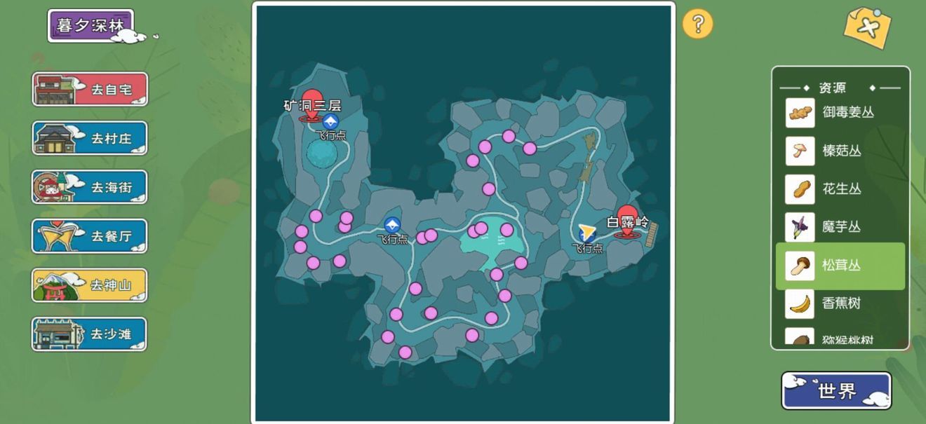 我们在这张地图上可以采集到:柠檬、柿子、蓝莓、蘑菇(夜晚刷新)、灯闪果(果丛附近随机刷新)、和雨籽、忍冬花(果丛附近随机刷新)、万顷笋。地图右边点开资源有分配。