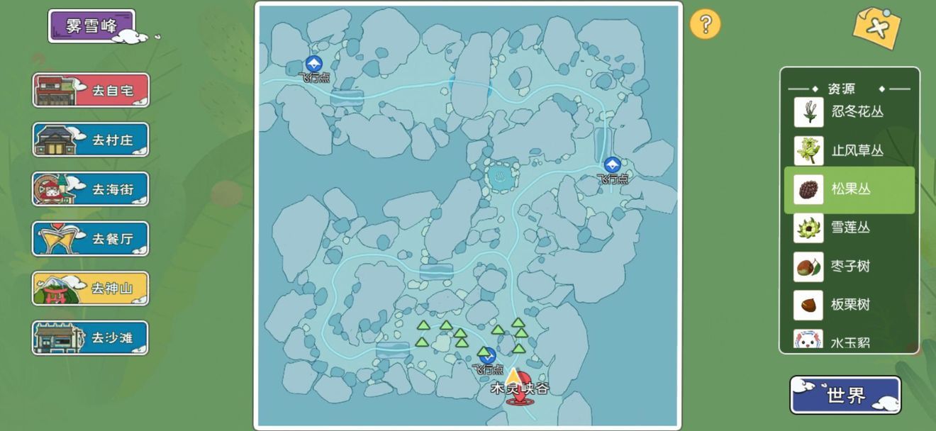 我们在这张地图上可以采集到:松果、板栗、雪莲、枣子、止风草、忍冬花;地图右边点开资源有分配。
