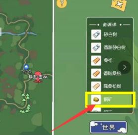 3、到达之后,点击右上角打开地图,点击右边的铜矿,地图绿色标记就是铜矿,点击可以自动前往;