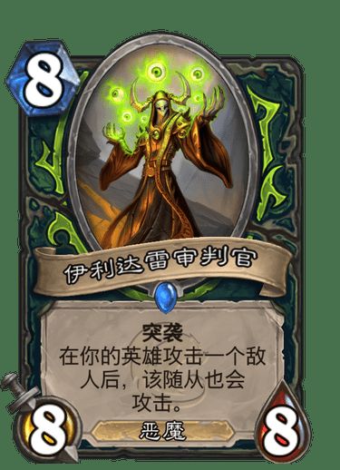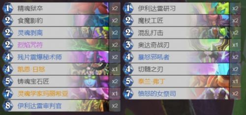 这是一套不带【古尔丹之颅】的中速残片瞎。亮点在于核心系列带来的新卡【伊利达雷审判官】。这张卡过墙打脸一体,4费打【暴怒邪吼者】,5费【泰兰·弗丁】检索,6费【伊利达雷审判官】有点恐怖。4费打【暴怒邪吼者】,5费【愤怒的女祭司】也是很强的节奏。不带【古尔丹之颅】是因为卡组高费多,容易卡流放。
