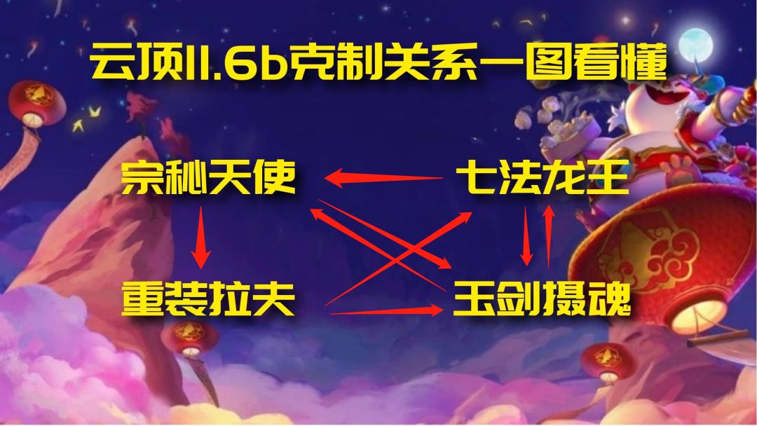 宗秘天使站在食物链最顶端,天克重装奥拉夫,跟玉剑男刀55开。但是容易被天使克制,因此也有衍生出的山海裁决天使版本,这套阵容主要增加了4秘术能够极大的提升了阵容整体的抗性。但是相对传统的宗秘和天神天使阵容来说,山海天使强度稍微弱了点。像重装奥拉夫就非常克制七法天使阵容,但是会被宗秘裁决克制。而龙王刚才也说了克制宗秘天使,被拉夫克制。这三套阵容就直接形成了一个闭环,相互相克,相爱相杀非常nice。
