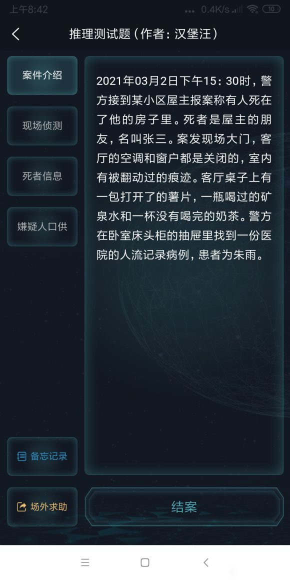 2021年03月2日下午15:30时,警方接到某小区屋主报案称有人死在了他的房子里。死者是屋主的朋友,名叫张三。案发现场大门,客厅的空调和窗户都是关闭的,室内有被翻动过的痕迹。客厅桌子上有一包打开了的薯片,一瓶喝过的矿泉水和一杯没有喝完的奶茶。警方在卧室床头柜的抽屉里找到一份医院的人流记录病例,患者为朱雨。