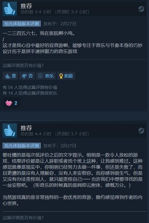选择“不推荐”的玩家,吐槽的地方就在于《节奏医生》的难度曲线设计问题,2-2和2-3相比第一大关难度飙升,成为了劝退关卡,即便是许多给予好评的玩家也提到过这点。所以很多人希望这方面能在EA阶段修改,制作组能在正式版给出更令人满意的答卷。