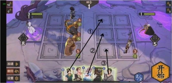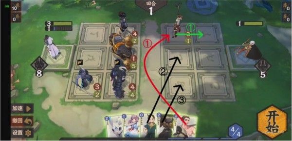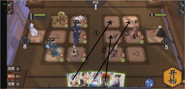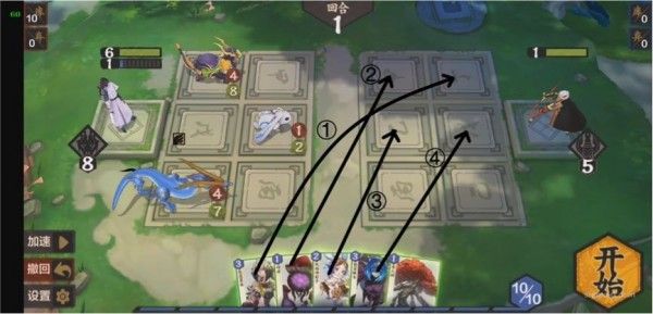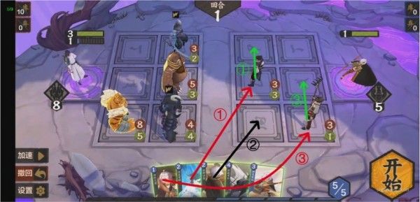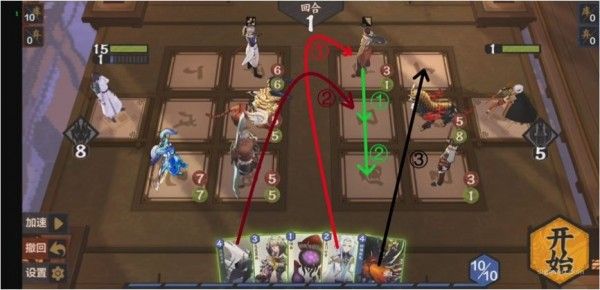 本关需要巧妙使用法术。通过对局势的观察发现,我们必须从上路或中路破敌,同时3灵和4灵法术消耗太大,肯定不能使用。所以应当从其他的法术卡里想办法,如果要从上路破敌,显然是不现实的,因为至少需要在后排放上两张卡,导致卡不够用,所以采取中路破敌,上路就利用某张法术将(233)推上去,中路利用某张法术将(131)推上去同时在场的一张法术保证其不死,同时将(444)抵挡住又需要一张法术(注意幼时之盟会抽卡暴死,所以一定要在其翻开之前结束战斗,指定随机),思路如下: