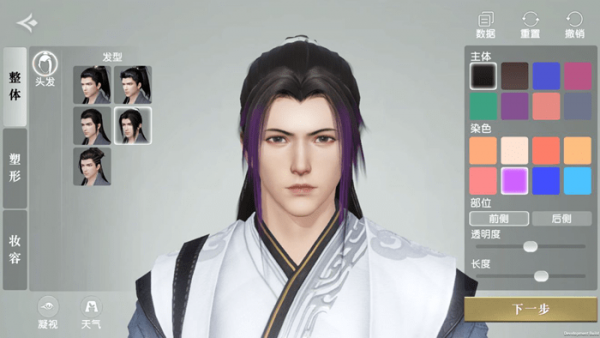 俗话说人靠衣装,好的发型给人的感觉当然也不一样。我们打开【整体】-【发型】界面,选择这款仙气满满的发型。中分刘海和长辫子,凸显出儒雅随性的风格。另外,还可以选择不同的颜色进行染色,什么奶奶灰、翠鸟绿啊都不在话下。