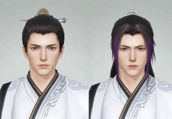 最后的调整中,为了更加契合服装的色调,我们把原先的蓝灰色重新改为墨色,保留了紫色的发梢。这样一来,避免了色彩上的冲突,而小奶狗听话乖巧的气质仍然保留了下来。接下来,一起看看捏脸前后的对比图吧!