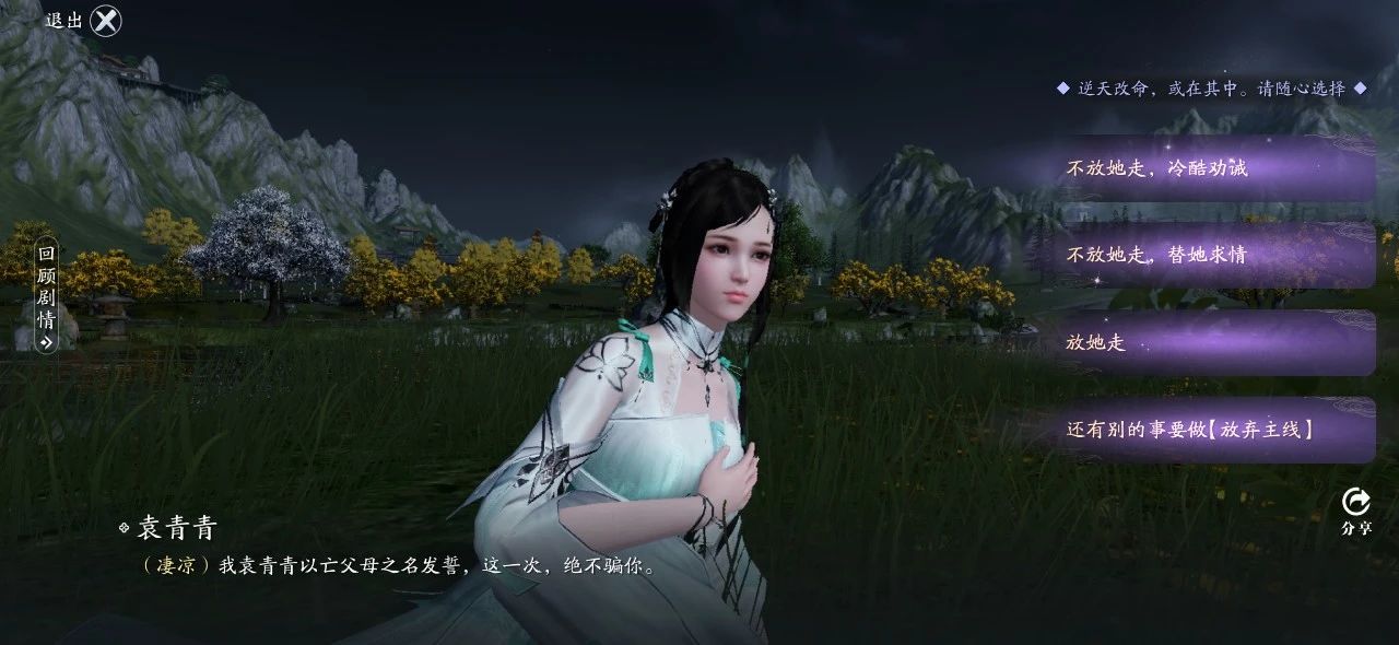 不管是少侠【不放她走,冷酷劝诫】还是【不放她走,替她求情】,这两个选项选择后,都有一个白玉京跳出来告诉少侠,袁青青是假死,然后以县主之仪下葬,再让少侠拆穿。