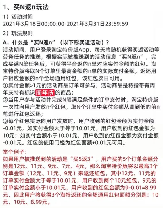 淘宝特价版现在正在进行3月周年庆大促,推出了买N返N、单笔最高返10元活动,返还的无门槛红包全场通用,淘宝特价版首页进入3月周年庆,即可看到自己买N返N的任务,小编测试为买10返10,既买100返100元,完成买N返N任务需购买带周年庆标签商品,周年庆还有1分购、1元购活动,有需要的朋友们抓紧参与。