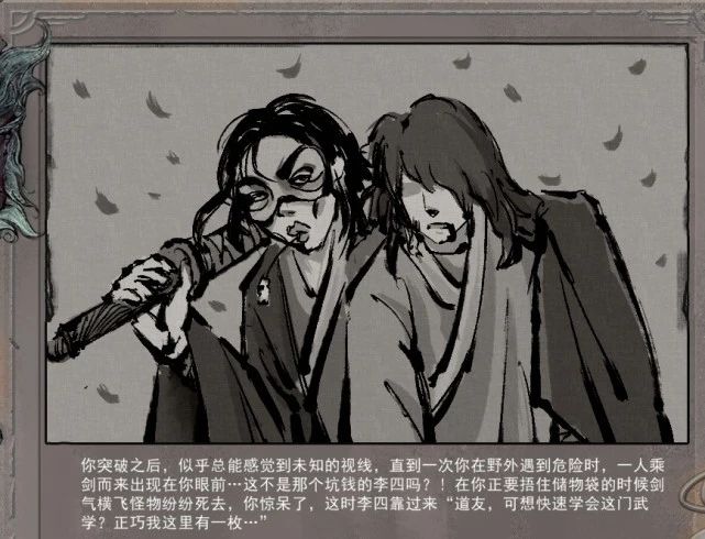 李四想必各位玩家已经不再陌生了。这个逆天改命的唯一槽点就是它的图片看上去有点基基的。文案是这么说的:“你突破之后,似乎总能感觉到未知的视线,直到一次野外遇到危险时,一人乘剑而来出现在你的眼前,这不是那个坑钱的李四吗?在你正要捂住储物袋的时候,剑气横飞怪物纷纷死去,你惊呆了,这时候李四靠过来说‘道友,可想快速学会这门武学?正好我这里有一枚……’”,这李四又想骗我们的灵石了。
