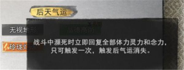 选灯获得气运“玲珑灯魂”战斗中濒死时触发生命、灵力、念力全回满(次数1次)用完消失。